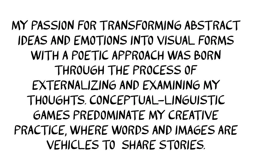 My work revolves around conceptual-linguistic games, the relationship between life, fiction, and normalcy because there is no such thing as normal.
