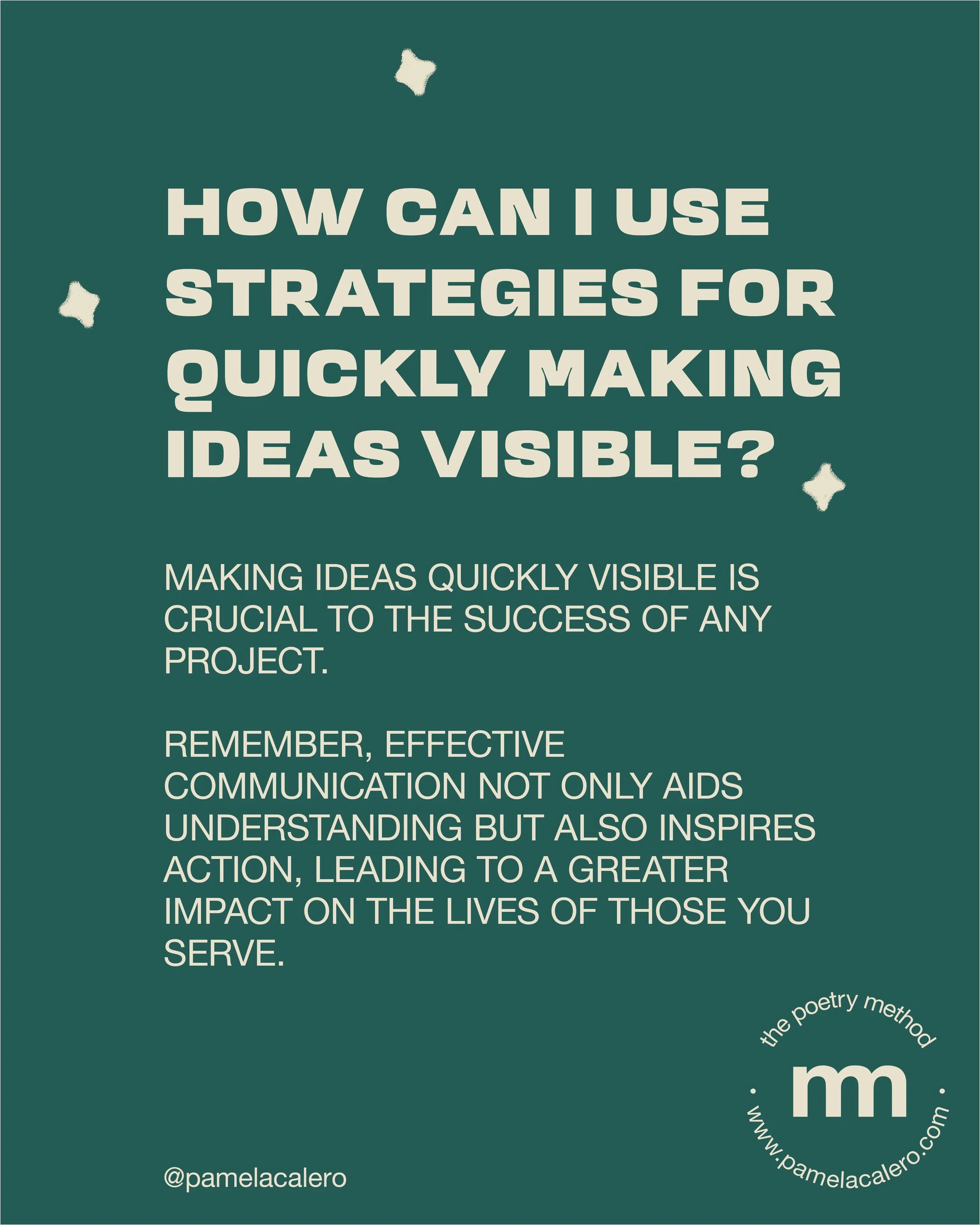 Making ideas quickly visible ensures that your key visuals will not only catch the attention of your audience but also leave a lasting impression on their minds. By adopting strategies like simplifying complex concepts, visual storytelling, and thoughtful design for accessibility and inclusivity, you can condense complex concepts into clear and concise visuals that convey the essence of your project at a glance.