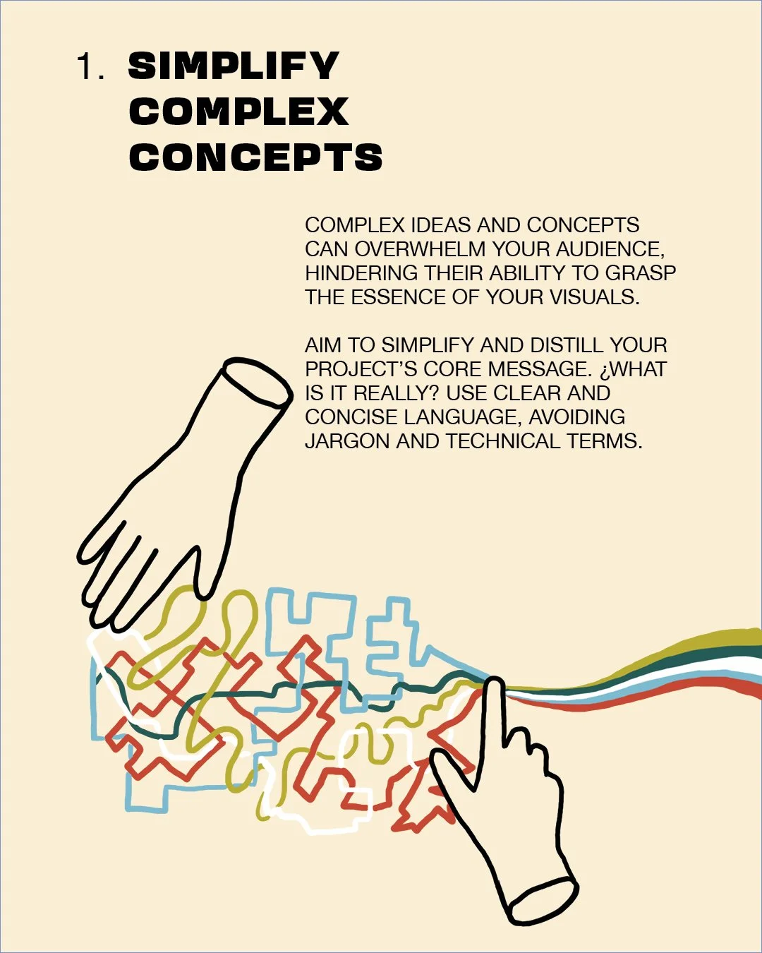 Complex ideas and concepts can overwhelm your audience, hindering their ability to grasp the essence of your key visual project. To make ideas quickly visible, aim to simplify and distill your project's core message. ¿What is it really? Use clear and concise language, avoiding jargon and technical terms.