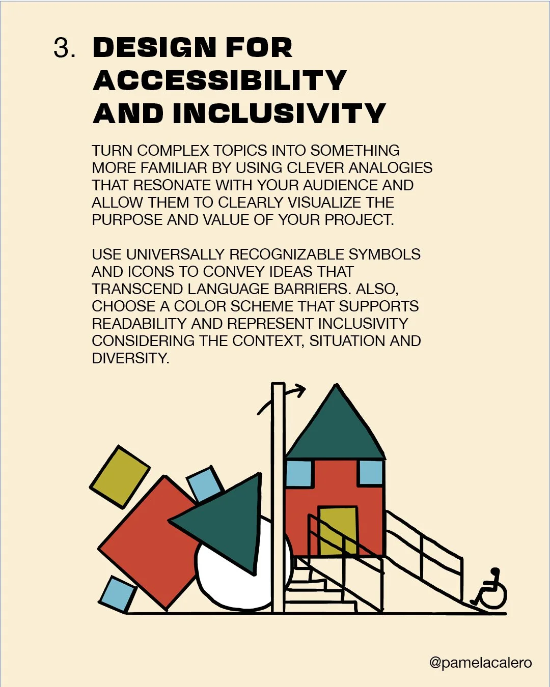 Your visual materials should be accessible and inclusive by people with different backgrounds, languages, and abilities. Use universally recognizable symbols and icons to convey ideas that transcend language barriers. Also, choose a color scheme that supports readability and represent inclusivity considering the context, situation and diversity. This will make your project accesible and nuanced.