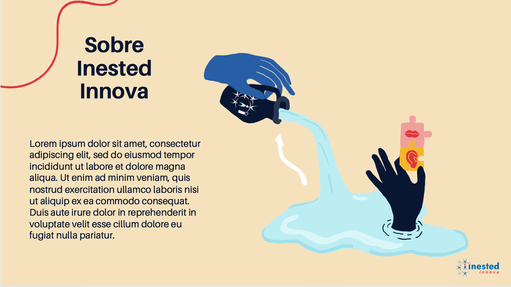 En el caso de Inested Innova, tras un proceso de bifurcar su concepto y adentrarnos en este, conectamos con su pilar de innovar, de dar frescura a una organización a través de sus herramientas y servicios. Por eso en el centro de la ilustración del paisaje de Inested hay una mano con un ánfora (que lleva su logo como guiño), y que vierte el agua que se convierte en lago del sistema. Inested reaviva, renueva, refresca; ese es nuestro storytelling.