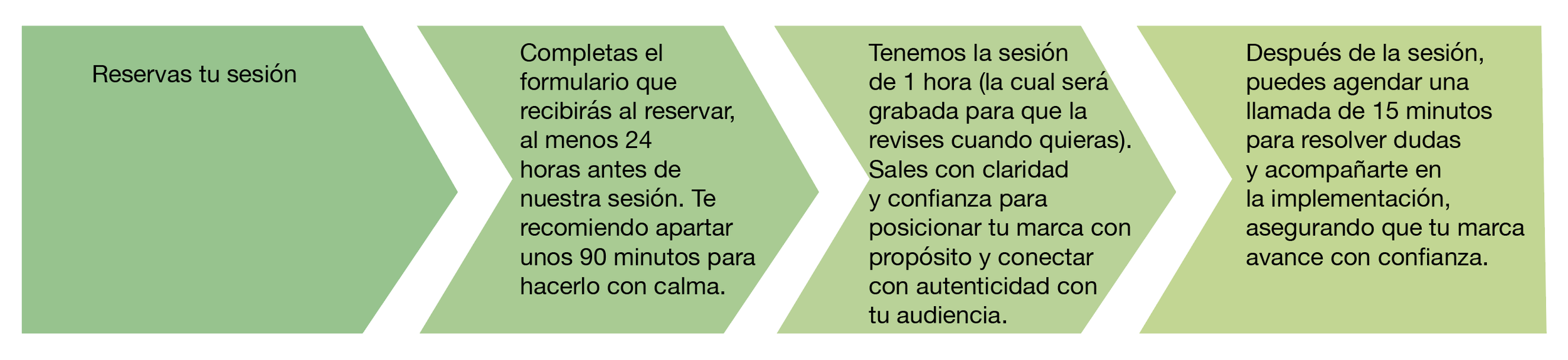 Entiendo lo importante que es salir de esta sesión con claridad y herramientas prácticas. Por eso, si al final de nuestra primera sesión sientes que no has alcanzado la claridad que necesitas, tendrás la opción de repetir la sesión sin costo adicional hasta que lleguemos a una solución que refleje la autenticidad y propósito de tu marca.